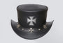 The standout element is the silver Maltese Cross prominently displayed on the front, accompanied by matching metal cross accents and rivet details around the hatband. This combination adds a touch of edgy sophistication, making it ideal for bikers, steampunk enthusiasts, or anyone looking to make a statement.