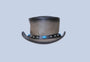 This distinctive top hat showcases a sleek grey leather finish, giving it a modern yet timeless appeal. Around the base of the crown, a black leather band is adorned with turquoise stone accents and silver studs, creating a bold contrast against the muted grey. The hat's upward-curving brim adds to its unique silhouette, making it a perfect accessory for those looking to stand out with a touch of southwestern flair and edgy elegance. Ideal for both formal and casual outfits, it merges traditional craftsmanship with a contemporary twist.