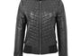 Crafted from high-quality genuine leather in a sleek black hue, this jacket features a round ribbed collar, long sleeves with ribbed cuffs, and a convenient zipper closure. The design showcases an eye-catching quilted pattern on the front and a smooth finish on the back. Additionally, the knitted waist offers a snug and comfortable fit.